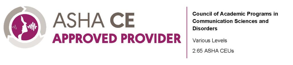 The Council of Academic Programs in Communication Sciences and Disorders is approved by the American Academy of Audiology to offer Academy CEUs for this activity. The program is worth a maximum of 2.65 CEUs. Academy approval of this continuing education activity is based on course content only and does not imply endorsement of course content, specific products, or clinical procedure, or adherence of the event to the Academy’s Code of Ethics. Any views that are presented are those of the presenter/CE Provider and not necessarily of the American Academy of Audiology.